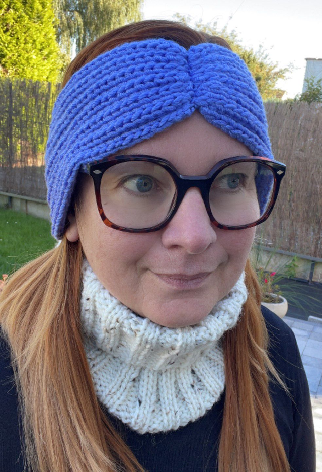Bandeau large forme pincé, tricoté main avec de la laine composée de 50 % polyester recyclé (bouteilles en plastique recyclées) x 50 % acrylique.