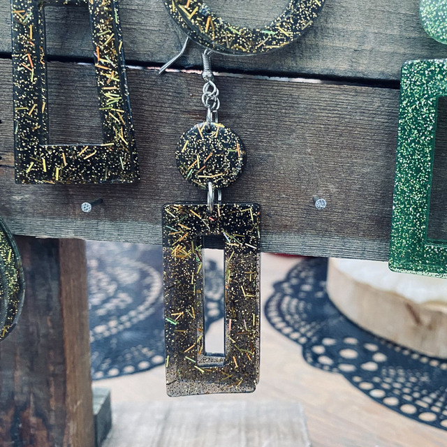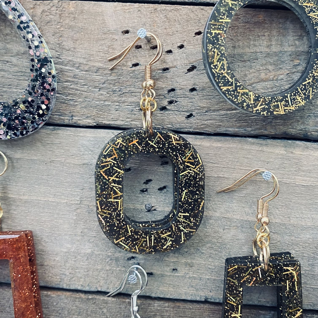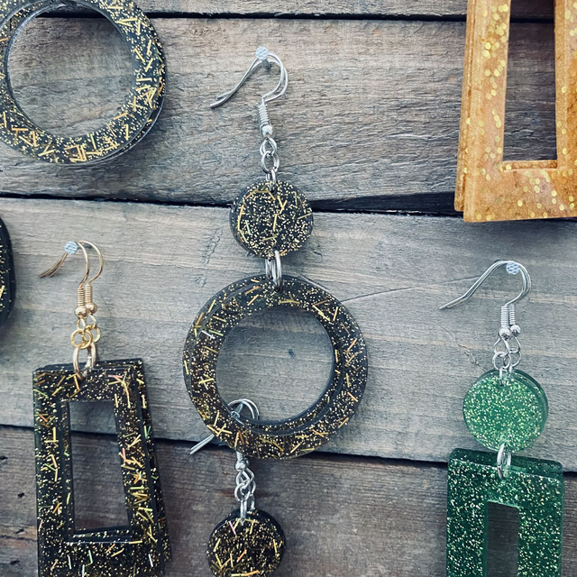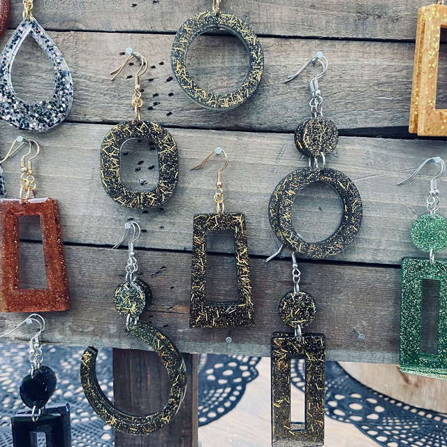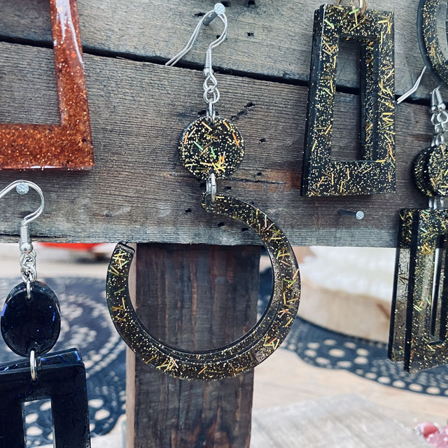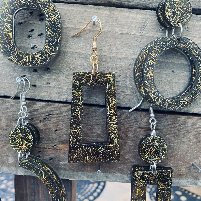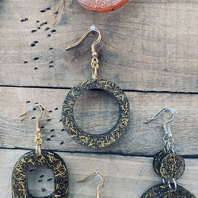 Colliers et Boucles d'oreilles entièrement fait à la main avec une boucle en epoxy incrustée de paillettes. fabrication artisanale et produits uniques au gré de ma créativité.