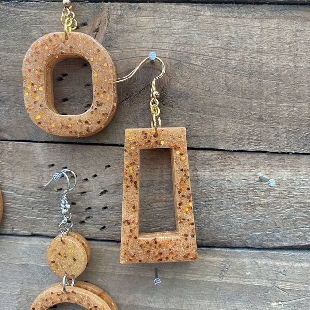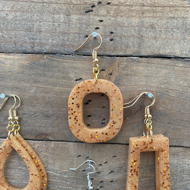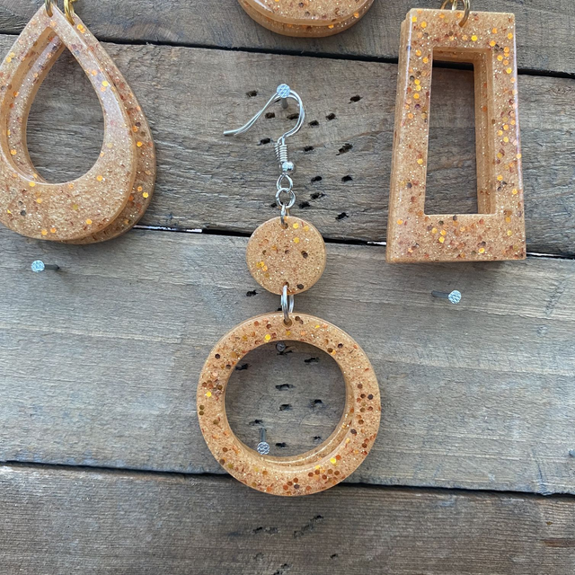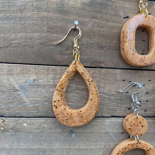 Colliers et Boucles d'oreilles entièrement fait à la main avec une boucle en epoxy incrustée de paillettes. fabrication artisanale et produits uniques au gré de ma créativité.