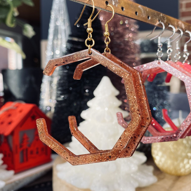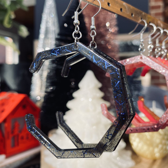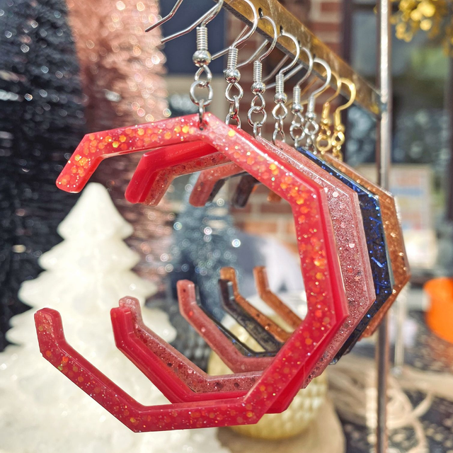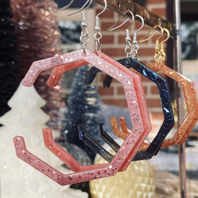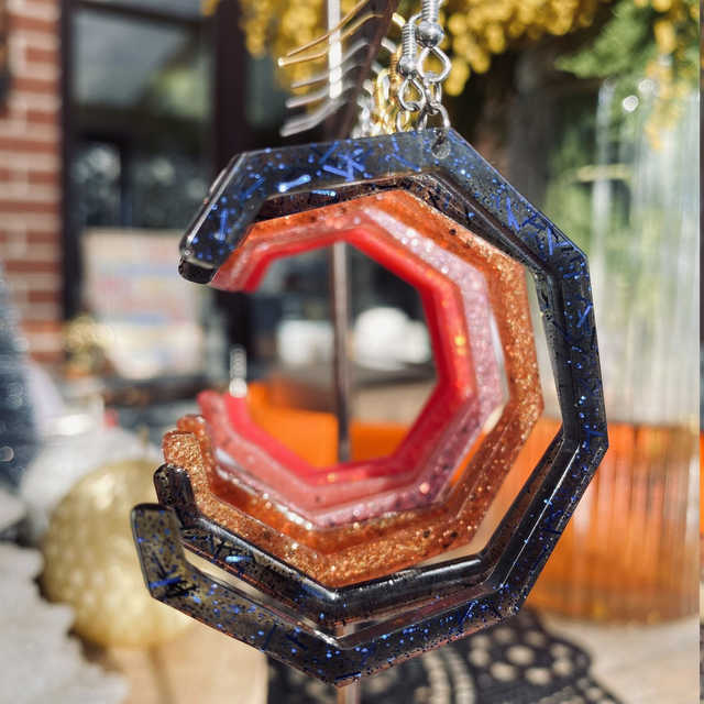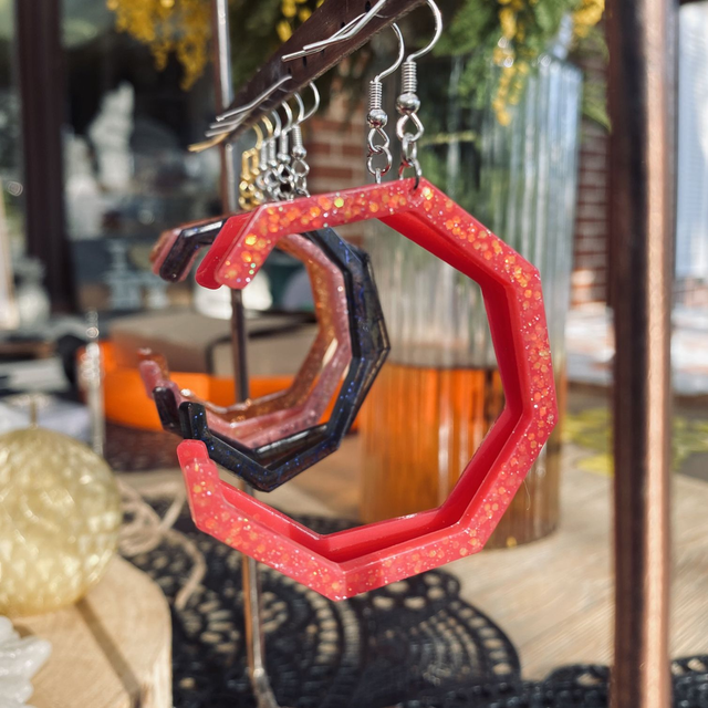 Boucles d’oreilles entièrement fait à la main avec une boucle en epoxy incrustée de paillettes. fabrication artisanale et produits uniques au gré de ma créativité.